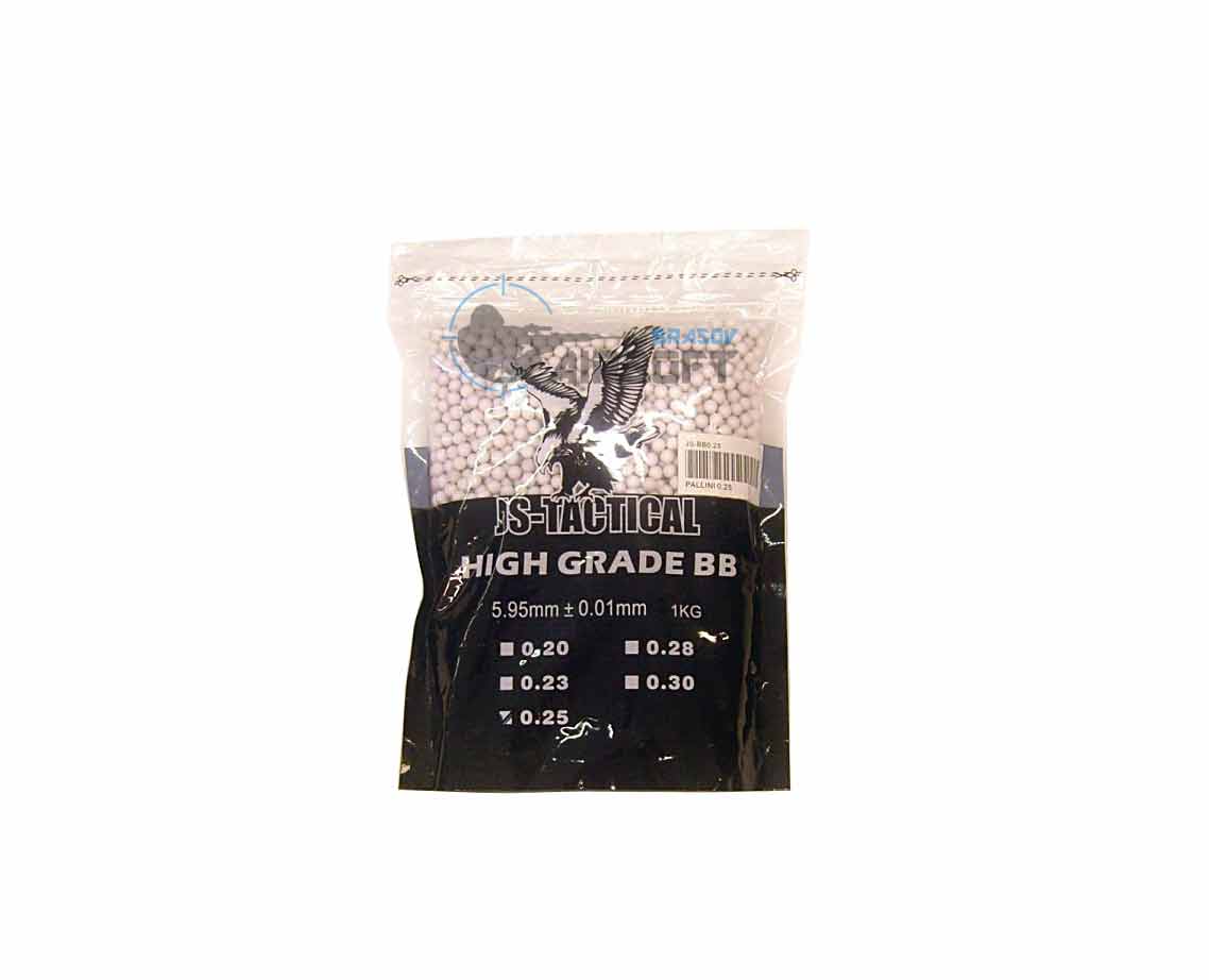 Bile airsoft marca JS-Tactical de culoare alba au o greutate de 0.25 g si un diametru de 5.95 mm cu o abatere de 0.01 mm. Printr-un proces avansat de fabricatie, aceste bile au un finisaj foarte bun.