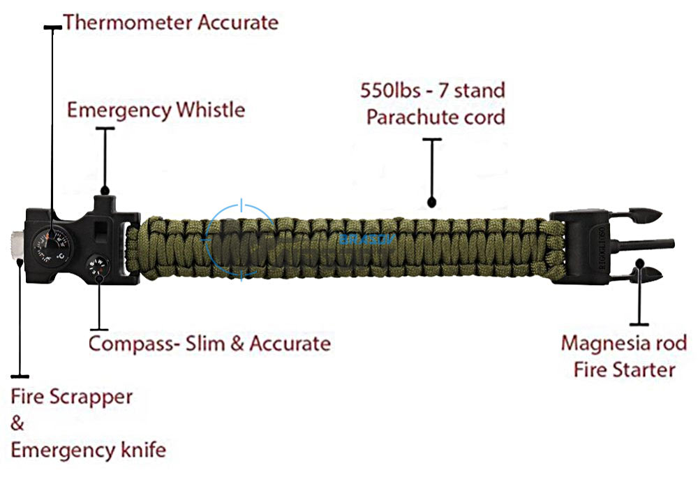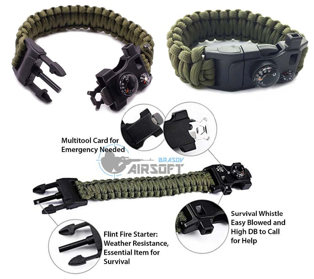 Utilitate: Snur paracor 3,5 metrii, utili in orice situatie,cremene,busola,cutit,led indicator 3 functii + s.o.s ,fluier,multitools(piulite,suruburi..etc),buzunar ascuns,cheita sim…